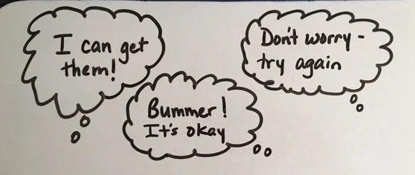 1. After the introductory talk about inner voice, we watched a YouTube that demonstrated perseverance. 2. As we watched a second time, I paused occasionally so students could come up with examples of what the character's inner voice may have been saying. We discussed how some were helpful, but others might have been overly critical, and less encouraging. 3. Students condensed the list to the three supportive thought bubbles and the single sign (that's the top row of illustrations). We talked about how those thoughts might be useful in many different situations. SESSION TWO 1. We reviewed our previous work. We watched a second YouTube video and found that our list of thought bubbles applied to characters in that story also. 2. In preparation for playing a board game, students listed feelings they might experience. We modified our three talk bubbles just a tiny bit (bottom left illustration), and started playing. When a student got a bad roll, or had to go back to the beginning of the game, I cued them "Do you need to think a thought bubble?" Each student was observed to do so at least twice in a 15 minute game. There were no outbursts during the game as there often were.